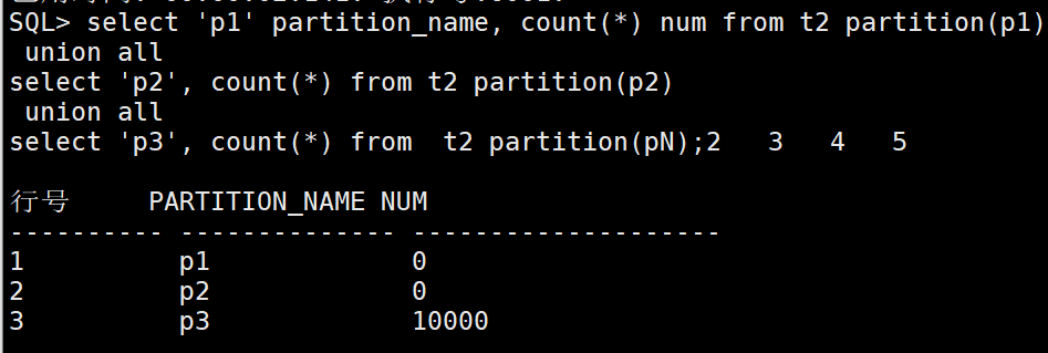 SQL> select 'p1' partition_name, count(*) num from t2 partition(p1)union allselect 'p2', count(*) from t2 partition(p2)union allselect 'p3', count(*) from t2 partition(pn);