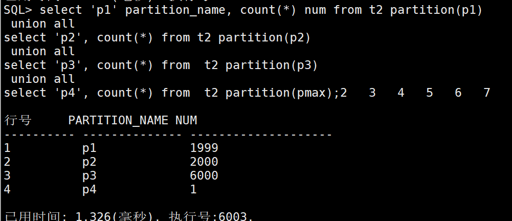 SQL> select 'p1' partition_name, count(*) num from t2 partition(p1)union allselect 'p2', count(*) from t2 partition(p2)union allselect 'p3', count(*) from t2 partition(p3)union allselect 'p4', count(*) from t2 partition(pmax);