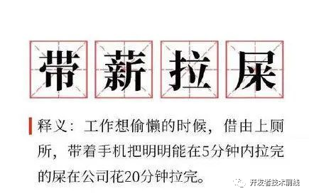 带薪拉屎,网络流行语,指工作想偷懒的时候,借由上厕所,带着手机把明明在5分钟内拉完的屎在公司花20分钟拉完。