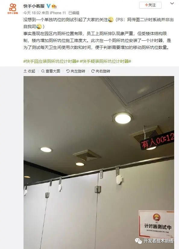 快手公司回应:装厕所坑位计时器,只是为了测试如厕次数与时间增加坑位数量。