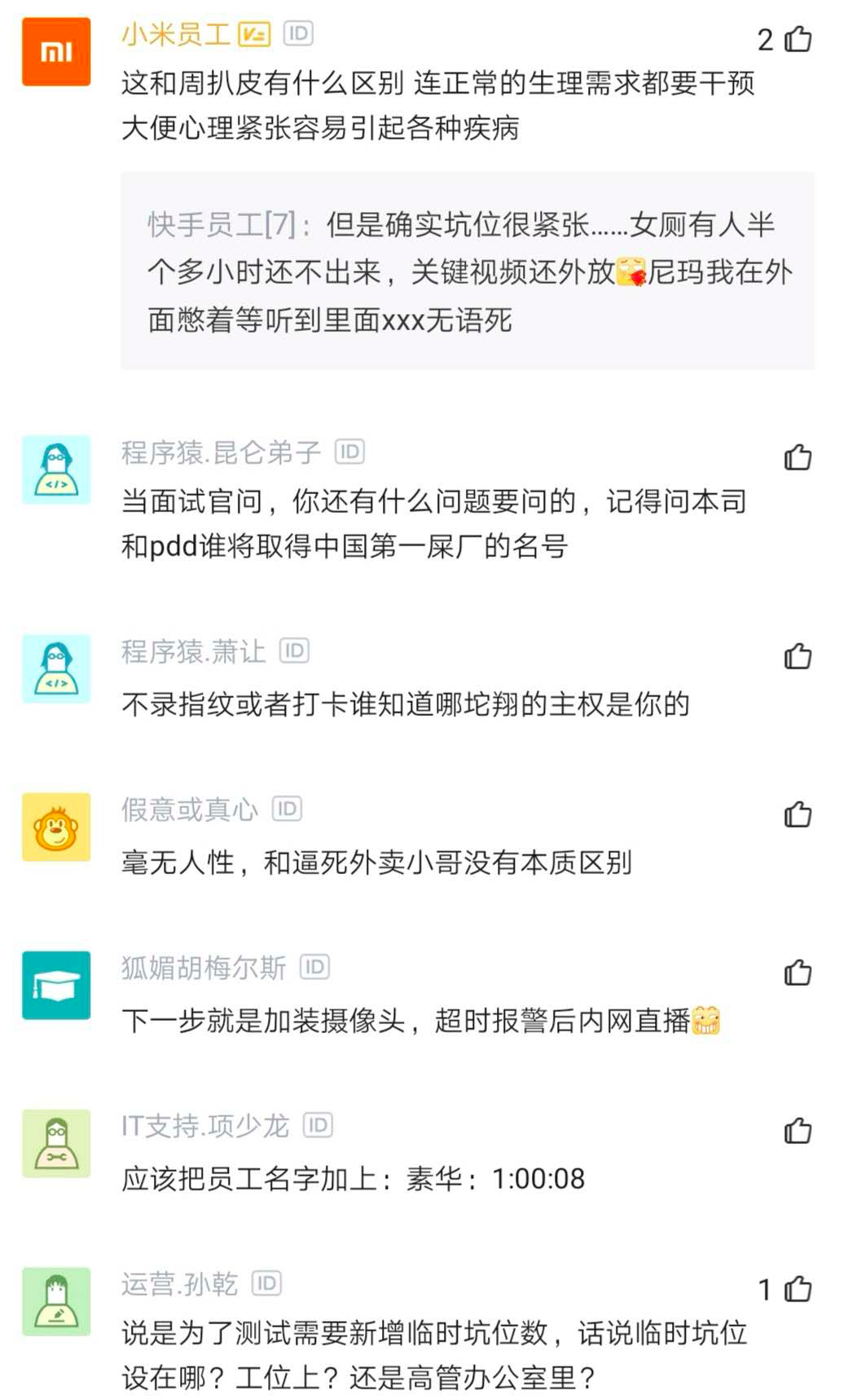 最后留言说说你们公司如厕情况,以及你的如厕时长。