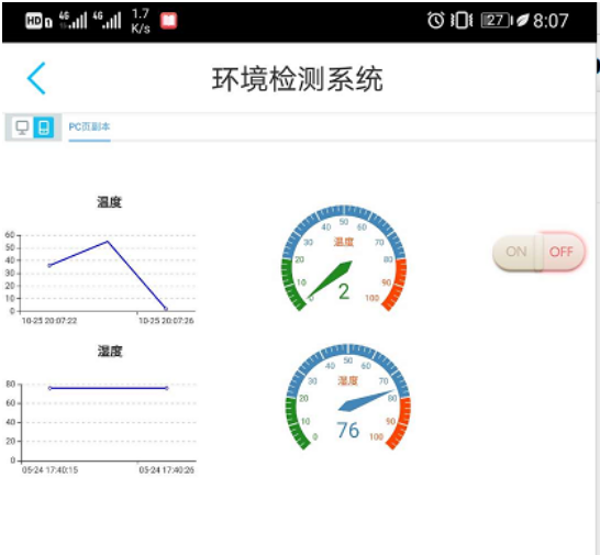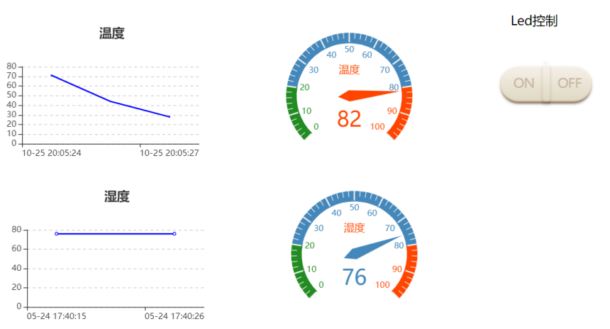 该网页的温度、湿度数据由 鸿蒙开发板(Hi3861)上传,同时有一个开关按钮,可以控制开发板的 LED 灯。