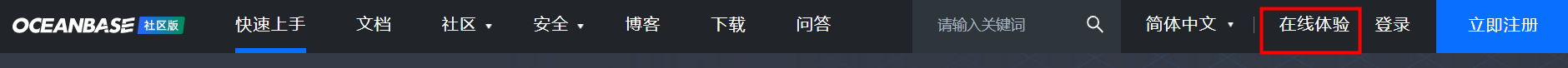 首先,登录 OceanBase 社区首页(https://open.oceanbase.com/),点击右上角导航栏 【在线体验】,即可进入。