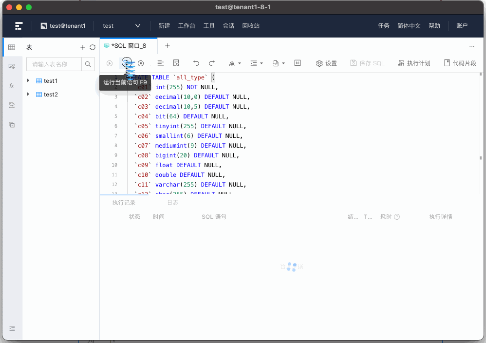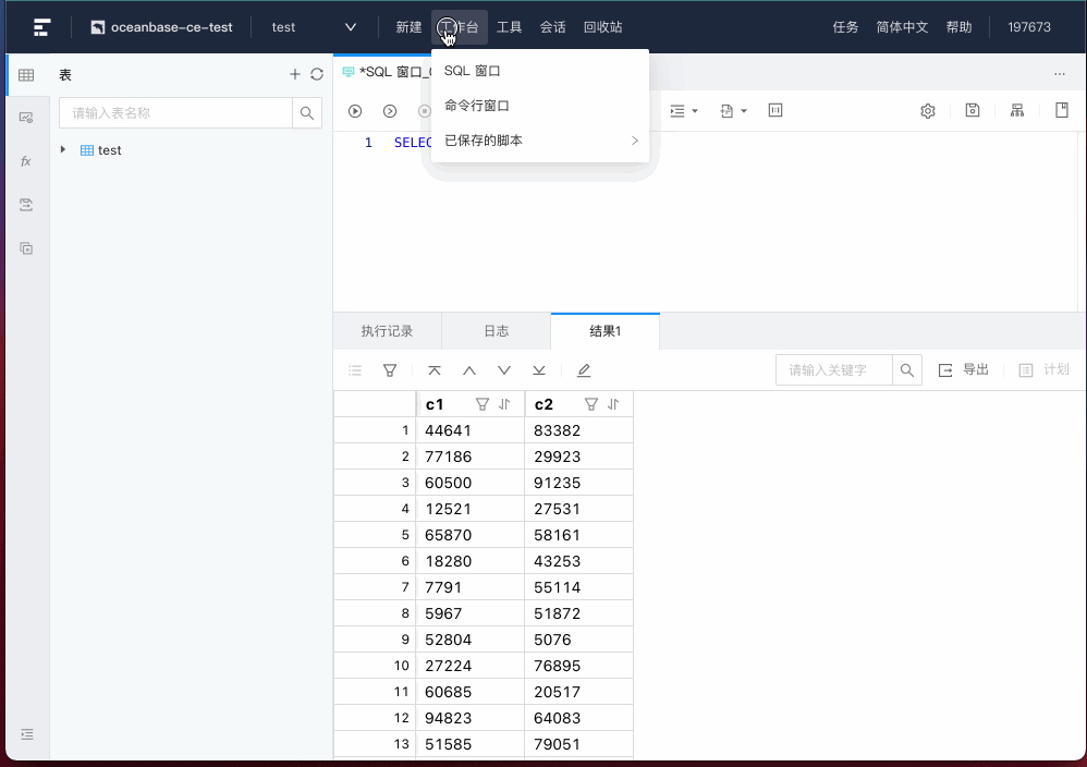 在线体验站为用户分配的公共连接是一个 OceanBase MySQL 模式的数据库。下面我们将从五个方面演示主要功能的使用: