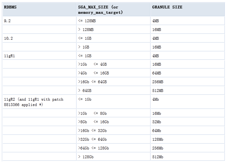 •GRANULE的大小与SGA大小和数据库版本有关: