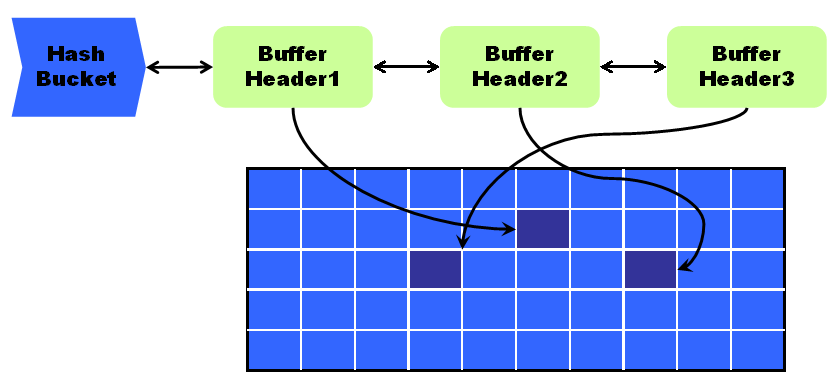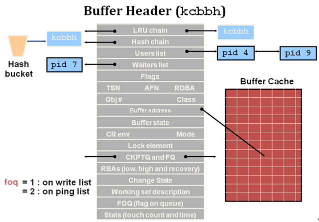•BUFFER HEADER指的数据块的缓冲块头,BUFFER HEADER的地址位指向真正的数据块缓冲区。