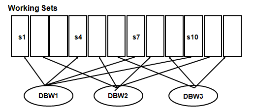 •DBWR进程扫描LRU主列脏块,然后将其移动(指针的变化)至LRU-W主列,DBWR进程写脏块时,会将脏块移动至LRU-W辅助列