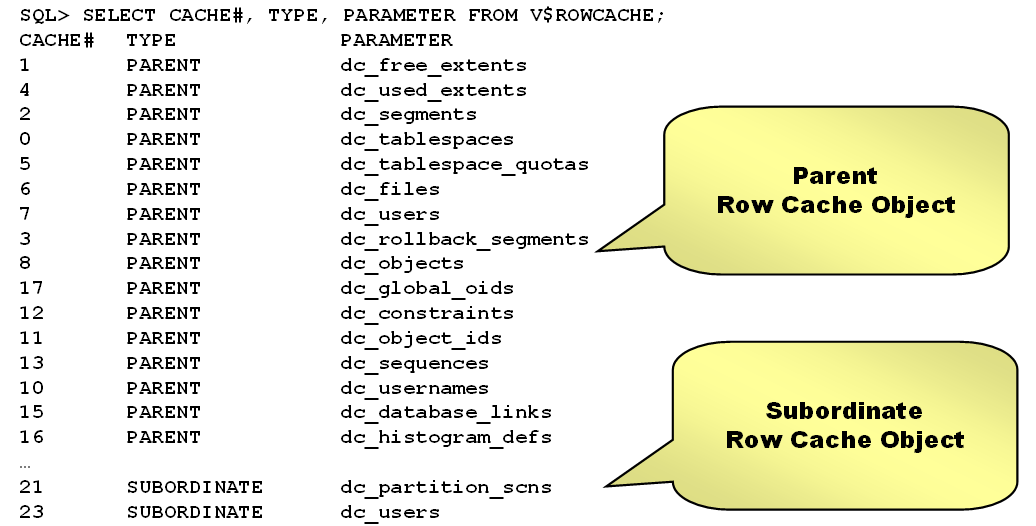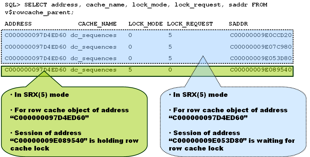 •可以通过v$rowcache_paraent查询holder和waiter: