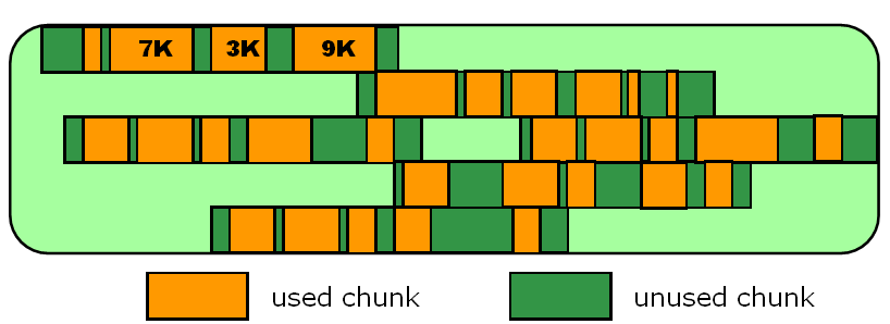 •分割连续的内存导致的内存碎片(chunk大小不一致),如下图:
