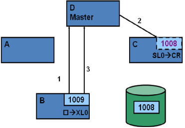3) 节点B将自己的锁降级,并且将本地的块1008 标识为CR。之后,节点B将块1008 修改为块1009,同时将通知节点D锁的属性为XL0。