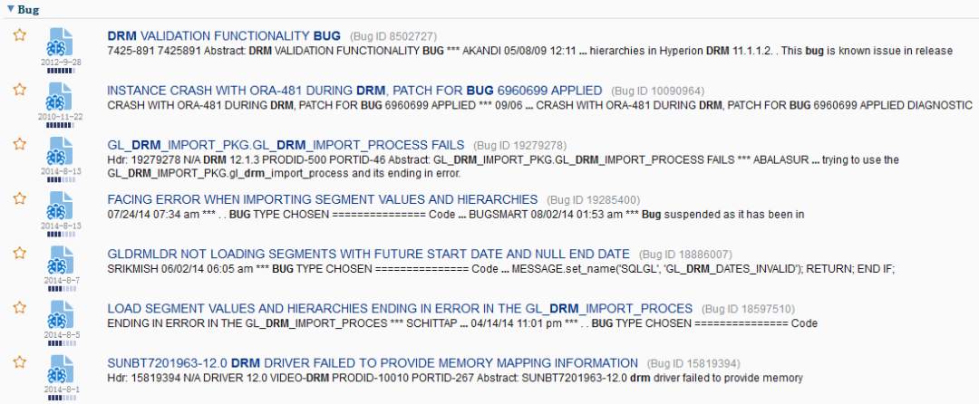 •DRM相关的bug让人防不胜防(数据库宕机,节点驱逐, 数据库挂起, ORA-00600),其bug列表如下: