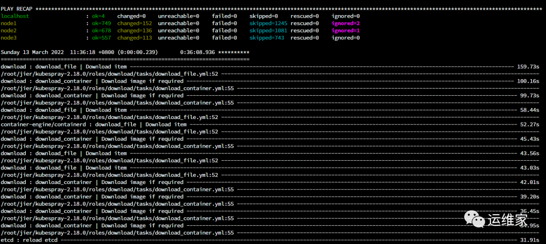 [root@node1 kubespray-2.18.0]# ansible --versionansible 2.10.15config file = root/jier/kubespray-2.18.0/ansible.cfgconfigured module search path = ['/root/jier/kubespray-2.18.0/library']ansible python module location = usr/local/lib/python3.6/site-packages/ansibleexecutable location = usr/local/bin/ansiblepython version = 3.6.8 (default, Nov 16 2020, 16:55:22) [GCC 4.8.5 20150623 (Red Hat 4.8.5-44)][root@node1 kubespray-2.18.0]## 从上面可以获取到目录,而后找到配置文件[root@node1 kubespray-2.18.0]# vim /usr/local/lib/python3.6/site-packages/ansible/config/base.yml# 找到参数 Gather facts timeout 和 Connection timeout,时间改为60DEFAULT_TIMEOUT:name: Connection timeoutdefault: 60DEFAULT_GATHER_TIMEOUT:name: Gather facts timeoutdefault: 60[root@node1 kubespray-2.18.0]#