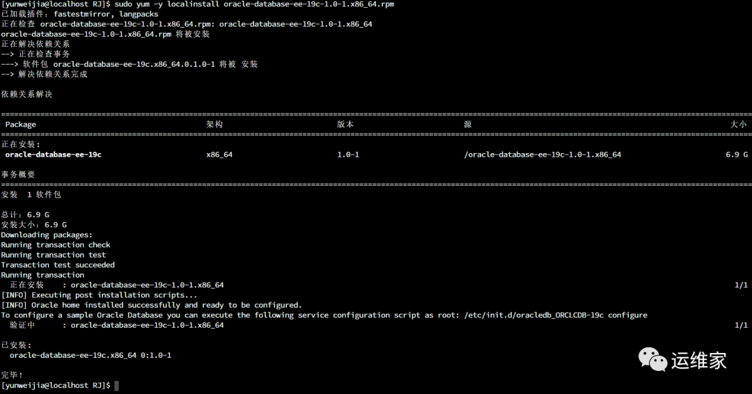[yunweijia@localhost RJ]$ pwd/home/yunweijia/oracle/RJ[yunweijia@localhost RJ]$[yunweijia@localhost RJ]$ sudo yum -y localinstall oracle-database-preinstall-19c-1.0-1.el7.x86_64.rpm[yunweijia@localhost RJ]$ sudo yum -y localinstall oracle-database-ee-19c-1.0-1.x86_64.rpm[yunweijia@localhost RJ]$