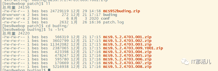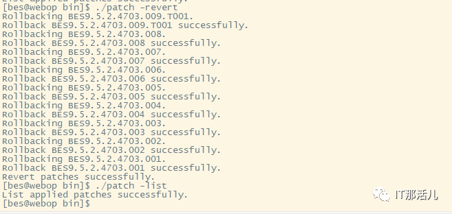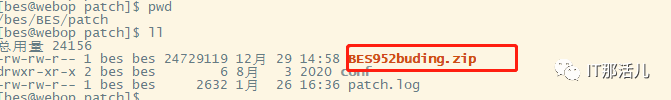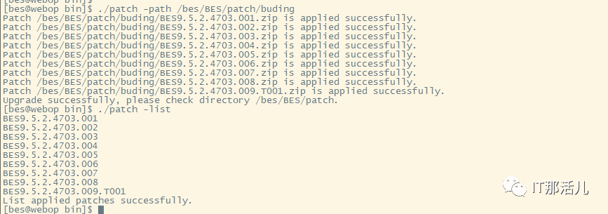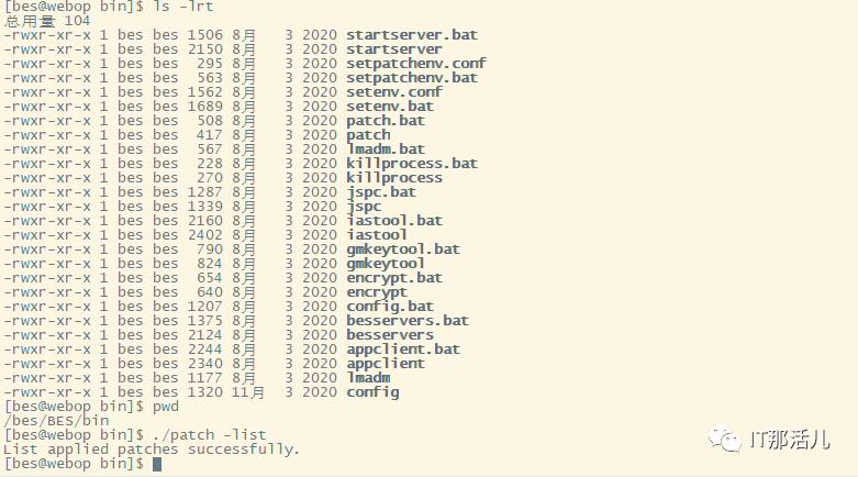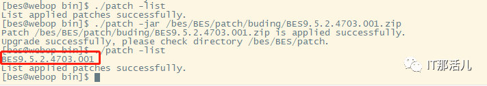 bes中间件和weblogic中间件相比,打补丁的速度明显提升,但是bes中间件的补丁规则却更加繁琐,先介绍一下bes补丁的规则。Bes应用服务器补丁包都以 zip 文件形式存在,并符合固定的命名规则。补丁的命名规则与补丁包基本一致,但以 jar 文件形式存在,并以 V 开头。1. 进入产品账号的bin目录下,用patch工具查看当前bes中间件所打补丁。根据返回结果可以清楚的看见,当前的bes并没有打过补丁。2. 上传补丁包到产品账号下的任意目录下,可以随意指定,建议放在bes产品账号下的patch目录下。3. 解压补丁包,如下图所示,可以看见我解压的补丁包为全量补丁。bes中间件打补丁有两种方式,第一种是按照jar包单独更打,第二种是将所需打补丁jar包放在目录下,按照目录批量更打。4. 按照目录更打bes中间件的补丁,进入产品账号bin目录下执行./patch –path path1[:path2…]./patch -path bes/BES/patch/buding5. bes中间件回退补丁,bes中间件运行回退补丁,有两种方式。./patch -revert patchVersion(补丁版本号)./patch -jar file1[:file2…]./patch -jar /bes/BES/patch/buding/BES9.5.2.4703.001.zip