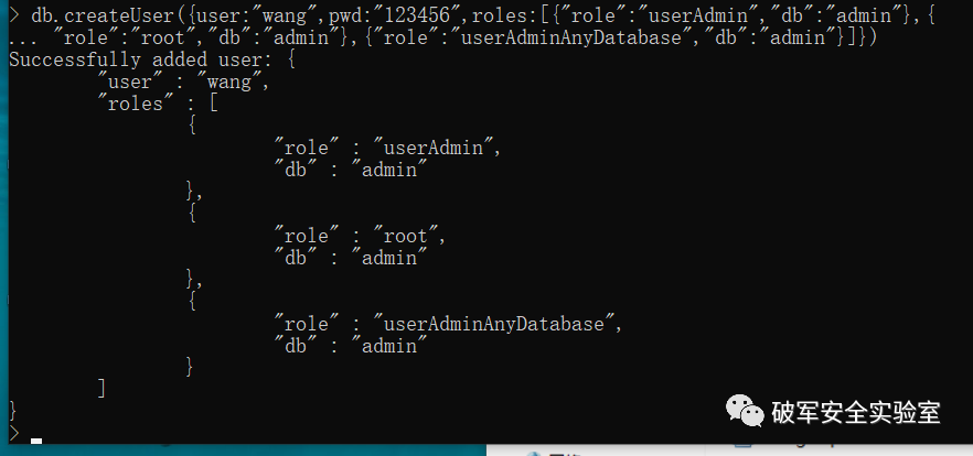 db.createUser({user:"wang",pwd:"123456",roles:[{"role":"userAdmin","db":"admin"},{"role":"root","db":"admin"},{"role":"userAdminAnyDatabase","db":"admin"}]})