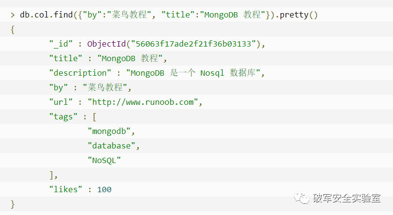 db.col.find({"by":"菜鸟教程", "title":"MongoDB 教程"})