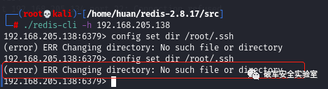 注意: redis 可以创建文件但无法创建目录,所以,redis待写入文件所在的目录必须事先存在。出现如下图错误是因为目标靶机不存在.ssh目录(默认没有,需要生成公、私钥或者建立ssh连接时才会生成)