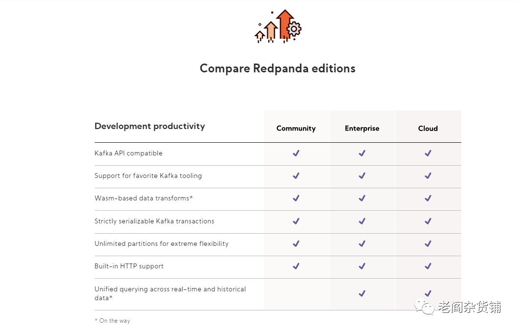 聊完了Redpanda的产品和技术,我们再来看看Redpanda的商业模式。最近几年,做Infra的公司一个比较成功的商业模式是open core,但是通过cloud和更丰富能力的enterprise版本来进行商业化。Confluent, Eleastic, Mongo以及Hashicorp基本上都是这一条路。有了前人探路,Redpanda自然也就完全可以借鉴这条成功的道路。同Kafka一样,Redpanda采用的是代码开源方式,作为一个面向开发者的底层系统,开源自然更容易获得开发者的信任以及构建一个开发者社区。商业上,Redpanda包含community, cloud以及Enterprise三个版本,如下: