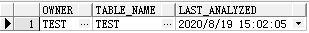select owner,table_name,last_analyzed from dba_tables Where owner='TEST' AND table_name='TEST';
