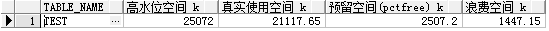 SELECT table_name, ROUND ((blocks * 8), 2) "高水位空间 k",ROUND ((num_rows * avg_row_len / 1024), 2) "真实使用空间 k",ROUND ((blocks * 10 / 100) * 8, 2) "预留空间(pctfree) k",ROUND (( blocks * 8- (num_rows * avg_row_len / 1024)- blocks * 8 * 10 / 100),2) "浪费空间 k"FROM dba_tablesWHERE table_name = 'TEST';