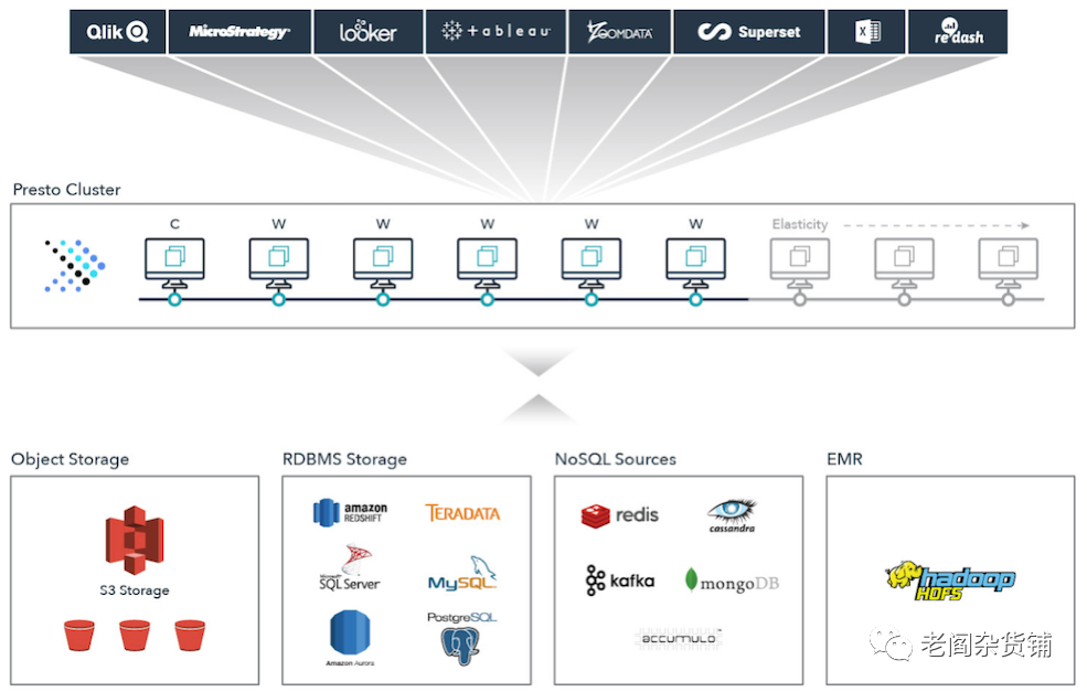 但是我们也知道,对于一些SaaS API类型的数据,数据抽取到数据仓库或者数据湖中再使用是必须的,但是对于很多已经存在对象存储、数据库、数据仓库中的数据,如果都把这些数据抽取到一个中心的数据仓库或者数据湖固然方便使用,但是这无疑会有更多的存储的浪费。在大数据技术发展到今天,存储和计算的分离是趋势,因为存储一般保证的是数据不丢失,更易于访问和使用,但是价格相对低廉。而计算则需要足够的弹性,从而保证能够在有SLA要求的时候可以通过更多的计算资源并行计算来降低计算时间。也正是因为这个原因,能够在原始数据上进行计算而不需要把数据搬到一起无疑是一个比较合适的选择,Trino(Presto)就是基于这个思想而进行设计的。下图是Trino(Presto)工作的一个示意图: