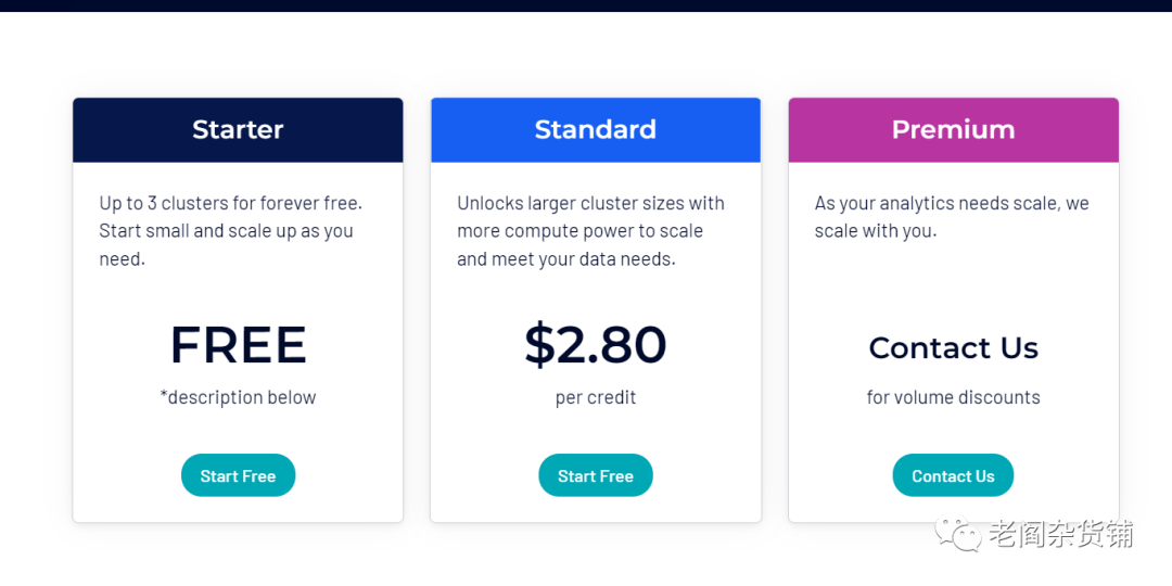 与大多数目前的Infra公司一样,Starburst采用的也是open core的策略。Trino开源社区目前采用Apache 2.0的授权方式。Starburst基于Trino,有Starburst Enterprice和Starburst Galaxy两个平台。前者通过在开源核心的基础上增加了安全、管理等等能力,另外加上服务卖给一些需要私有化的企业客户。而Starburst Galaxy则是hosting在云上的版本,其定价模式也是采用了现在云原生的Infra公司常见的定价模式-充值然后转为credit(Snowflake模式),然后根据计算来消耗credit。当然,为了能够吸引更多的用户,Starburst Galaxy也有free的入门版本让人去体验。其具体定价如下: