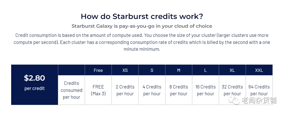 具体如何消耗Credit, Starburst基本上也是学习了这个领域的老大哥Snowflake,如下: