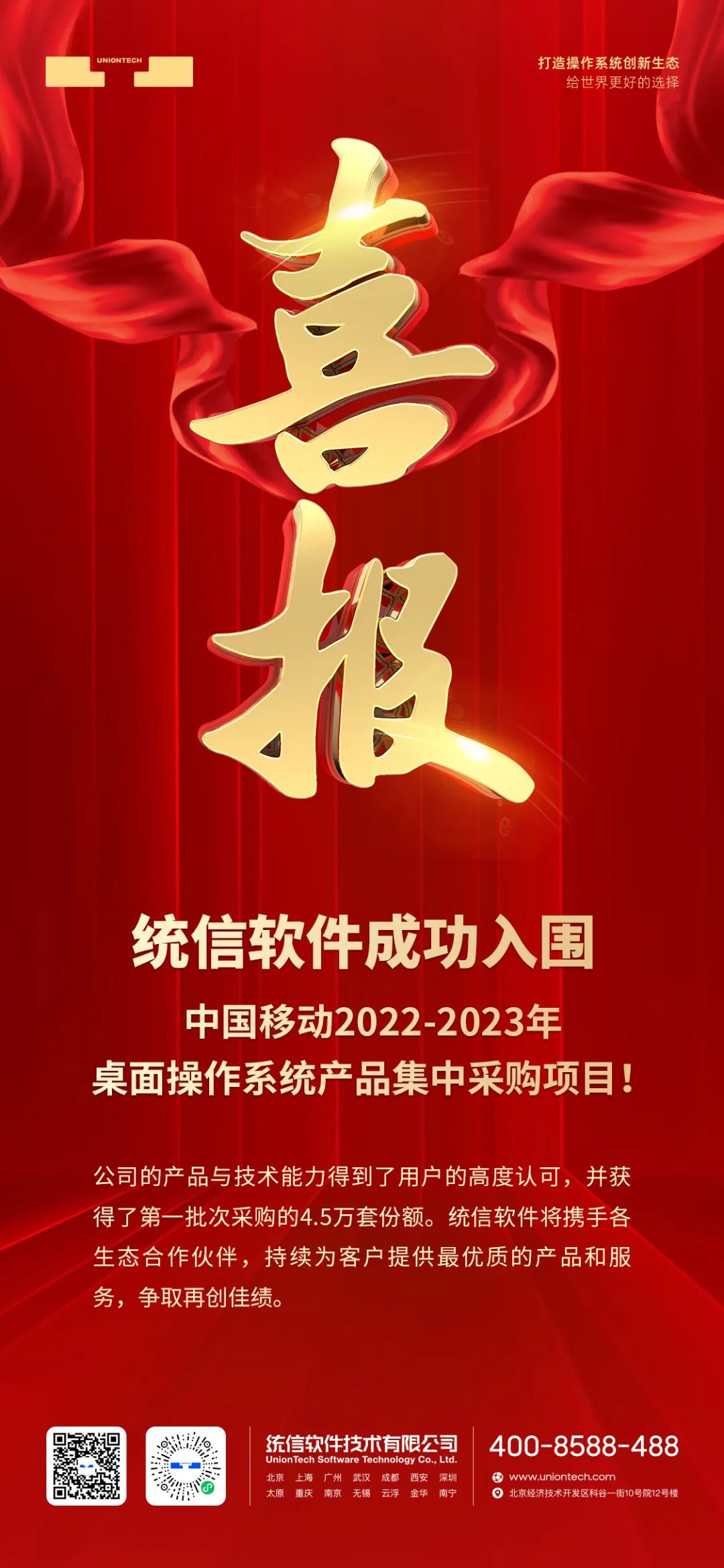 近日,统信软件成功入围“中国移动2022-2023年桌面操作系统产品集中采购项目”!统信软件产品与技术能力得到了用户的高度认可,并获得了第一批次采购的4.5万套份额。