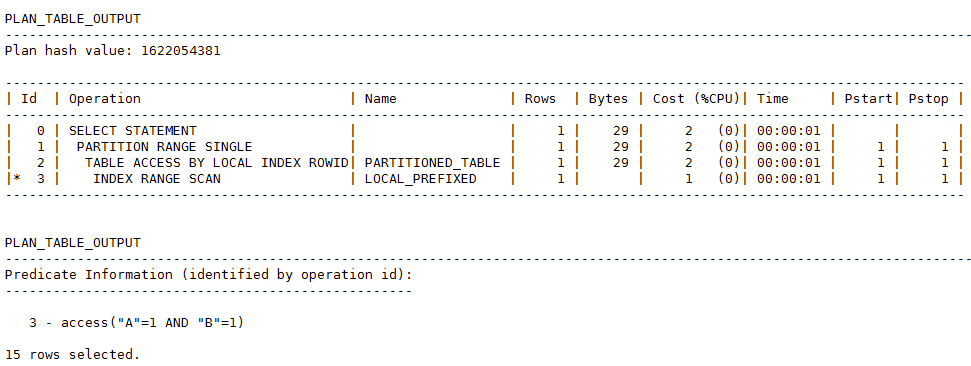 SQL> select * from partitioned_table where a = 1 and b = 1;A B DATA---------- ---------- --------------------1 1 xSQL> explain plan for select * from partitioned_table where a = 1 and b = 1;SQL> select * from TABLE(DBMS_XPLAN.DISPLAY('PLAN_TABLE'));
