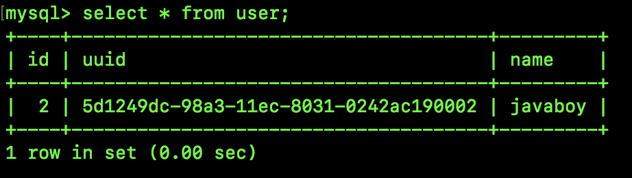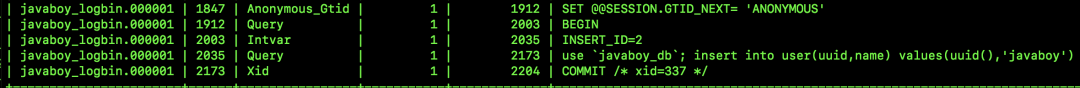 从图中可以看到,记录在 binlog 原文中的日志是:use javaboy_db; insert into user(uuid,name) values(uuid(),'javaboy')