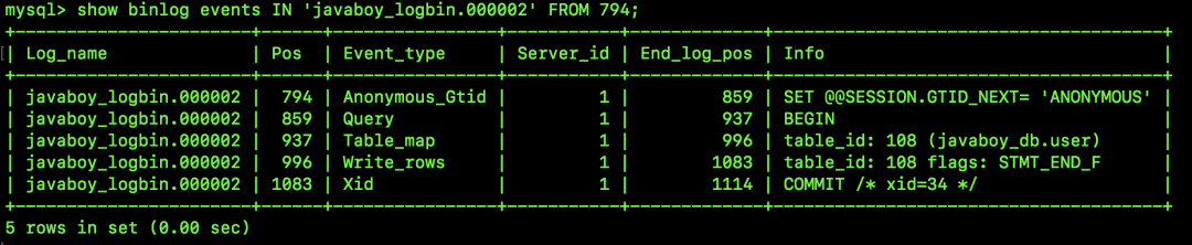 show binlog events IN 'javaboy_logbin.000002' FROM 794;