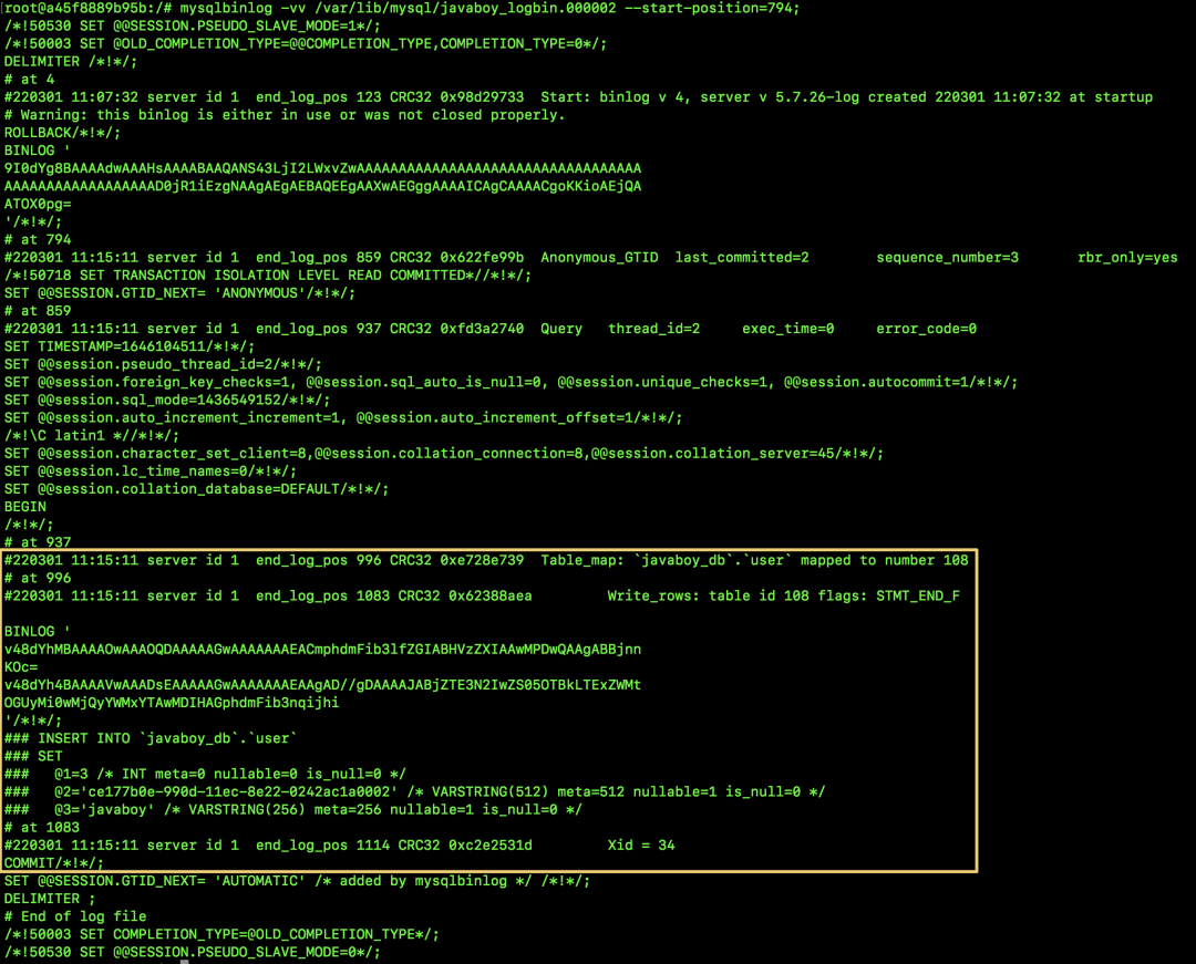 mysqlbinlog -vv /var/lib/mysql/javaboy_logbin.000002 --start-position=794;