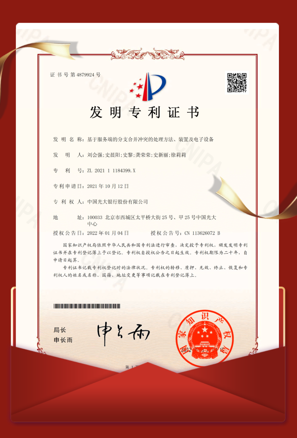 中国光大银行积极提升自主研发能力,加强科技创新,在源代码管理过程中深入研究、探索,形成完整的源代码文件冲突在线解决方案,提升代码合并效率,助力实现“敏捷、科技、生态”发展目标。近日,该方案的核心技术“基于服务端的分支合并冲突的处理方法、装置及电子设备”成功获得国家知识产权局颁发的发明专利证书,体现测试管理在源代码管理领域取得突破性成果。