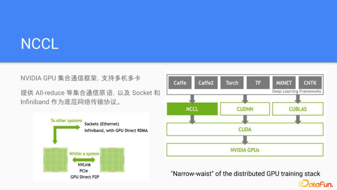 在GPU的训练场景里面,集合通信往往跟NCCL是同义词。NCCL是NVIDIA实现的一个集合通信库,它提供了像allreduce, allgather, broadcast等集合通信原语以及高性能的实现,用来支持多机多卡的训练。对于节点内通信,支持NVLink,PCIE和device P2P等方式;对于节点间通信支持像Socket和Infiniband等网络协议,并且网络协议可以支持通过用插件的形式来扩展。从软件栈的角度来看,NCCL对主要的训练框架都提供了支持,并且是主流框架默认使用的GPU的通信库。拿网络的协议站做一个类比的话,NCCL基本上跟IP协议一样,是整个协议栈的narrow waist的位置。