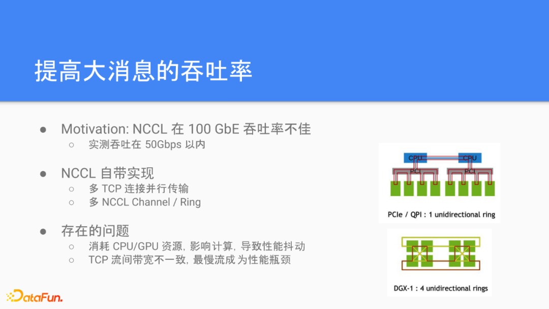 我们认为NCCL特别适合用来作为框架无关的性能提升的着力点。具体到几个通信的优化,我们可以分为两类,一类是对于底层通信网络栈的优化,而另一类是对于几个通信算法的优化。那么接下来我们将会用两个例子来分享我们在这两个方面做的工作。