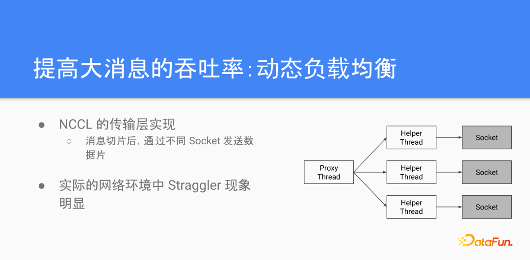我们可以仔细看一看NCCL的传输层的实现,简单把它抽象成右边这个图里面显示的这么一个结构。当NCCL获得最上层的传输请求之后,他会用Proxy的线程将准备传输的消息切片,然后用Round Robin的方式把切片后的数据交给Helper线程,通过不同的Socket发送到对面的节点。理想的情况下,Socket之间的带宽相会是相等的,所以这种方式看起来应该是没有什么问题。但实际的数据中心网络里面影响带宽的方式很多,像如果是有multi-path的话,不同的connection会被路由到不同的path上,路由器的buffer占用也不一样,所以就会导致不同的连接的带宽并不均等,所以大消息的吞吐率往往会被这样的straggler连接给拖慢。