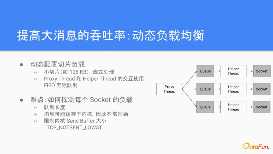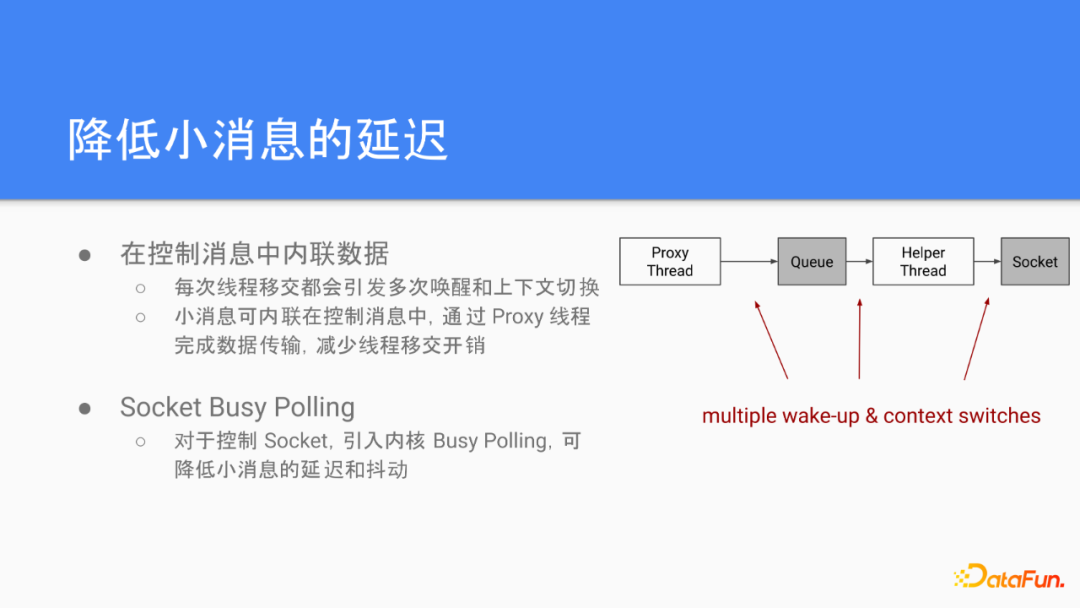对于小消息,我们重点关注的是降低延迟。前面提到消息的发送是需要通过Proxy线程到helper线程的数据交换,每一次的发送都会引起多次的线程唤醒,跟上下文切换,造成比较大的开销。我们解决这个问题的方法是通过Proxy线程直接控制Socket的发送,避免线程切换的开销。