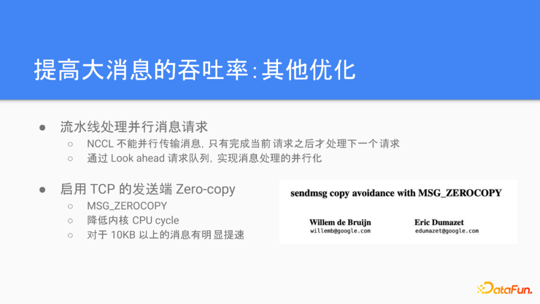 除了动态负载均衡,我们还改进了NCCL对于请求的处理方式。NCCL本来的实现是不能并行处理传输的消息的,它只能在完成当前的请求之后才能处理下一个请求。我们改进了这个方式,通过实现对请求队列的look ahead处理,可以流式地处理这个变行请求。另外,我们开启了发送端的zero copy来降低用户态到内核态的拷贝开销,对于大于十KB的消息,我们实测会有有明显的提升效果。