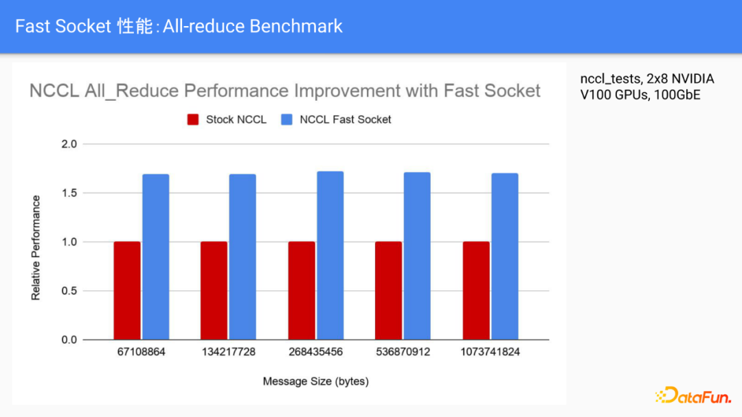 之前介绍了我们具体做的一些优化的措施,我们也测试了NCCL在64M到1G的消息大小上,对于all-reduce的网络吞吐率,可以看到经过Fast Socket的优化之后,NCCL在各个大小的带宽测试里面都取得了60%以上的加速比。在实际的100G以太网络里面,实际带宽也能跑到将近line rate的数字。