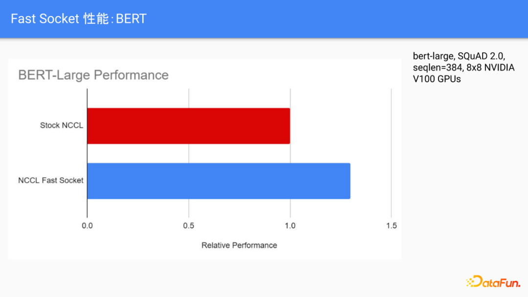 对于end to end的性能测试,Fast Socket也能取得一个比较明显的提速。图中显示的是在Fine-tune BERT-Large这种模型的时候,Fast Socket可在每秒训练的步数上会有大概30%以上的提速。这种提速是面向全平台的,所以我们不需要用户侧做任何的改动,就能让用户实际的落地加速的效果。