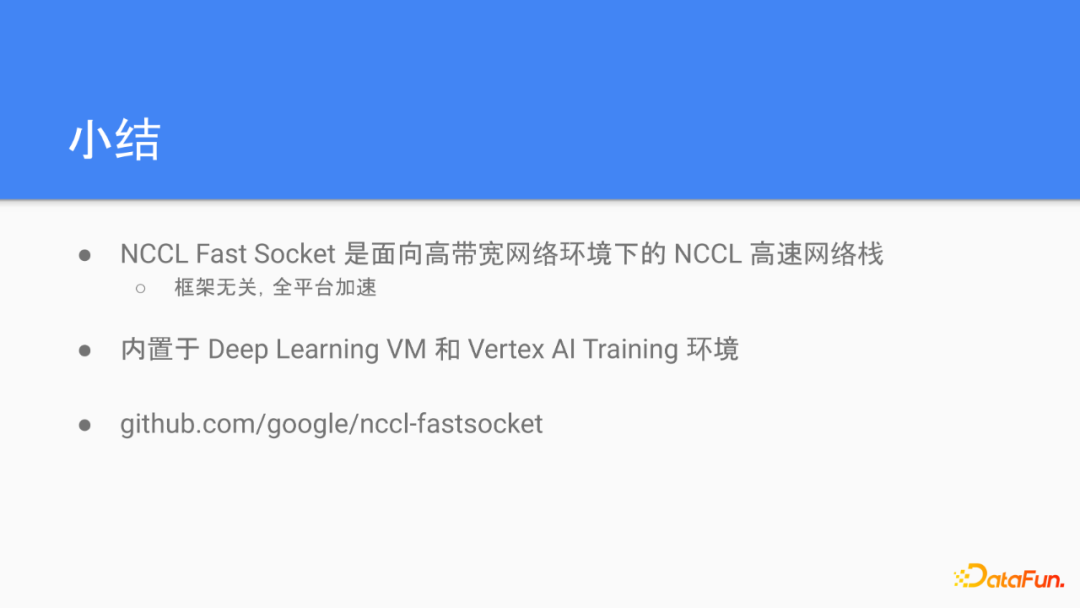 我们在此对Fast Socket做一个简单的小结。Fast Socket是我们为NCCL在高带宽的网络环境里面实现的一个优化的网络栈,因为这些优化都位于NCCL的通信层,所以支持所有的主流分布式的框架,并且能够做到全平台的加速。目前Fast Socket以插件的方式类似于Google Cloud的Deep Learning VM和Vertex AI等机器学习环境里,具体的实现代码,也以开源的形式开放给社区,欢迎试用和交流。