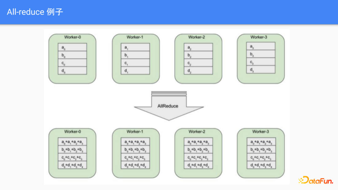 我们先给一个all-reduce的具体的例子来回顾all-reduce的语义,这里面每个worker的节点有一个等长的数组,在训练里面通常是对应于某个参数的梯度,因为在数据并行的训练里面,每个worker的训练输入的数据的批次不一样,梯度的数值也不同,因此我们需要对不同的批次的梯度求和,也就是对应于all-reduce的操作。操作完成之后,每个worker都会得到相同的结果。