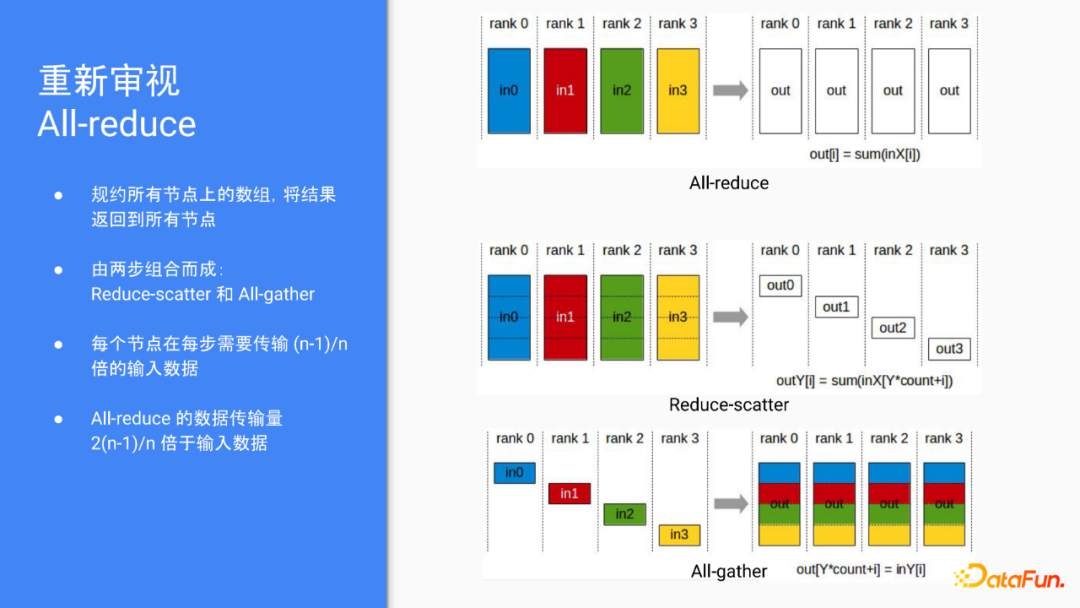 All-reduce有很多具体的实现,通常是可以由两步组合而成,通常分别是由reduce-scatter和all-gather的两步组合而成。Reduce-scatter完成之后,每个节点各自拥有N分之一完整规约过后的数据。