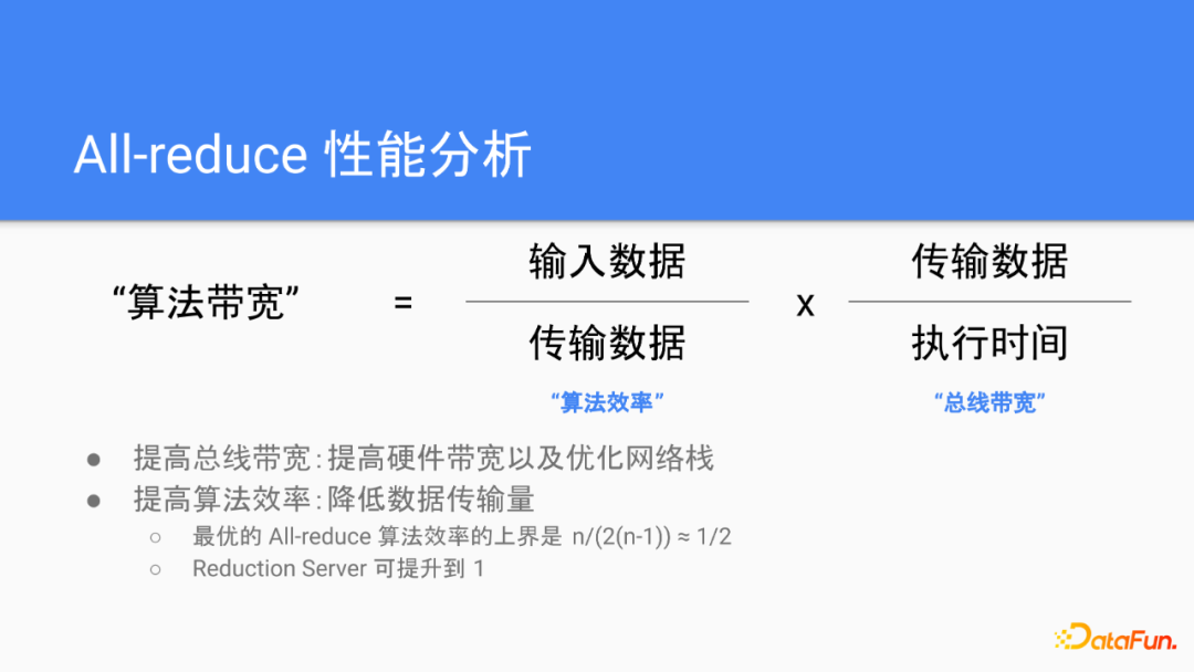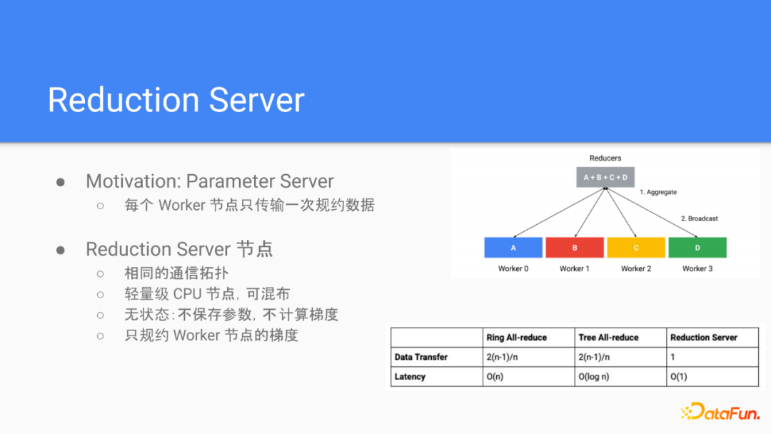 通过提高算法的效率,在这个场景下,也就是降低数据的传输量。一个可以证明的结论是all-reduce的算法效率理论上界是ring all-reduce目前的水平,也就是当N非常大,当工作节点的数量非常大的时候,大概就是1/2。我们的reduction server工作调整了all-reduce的一个设定,通过一个稍微不同的思路,算法效率提到了提高到目前的两倍。