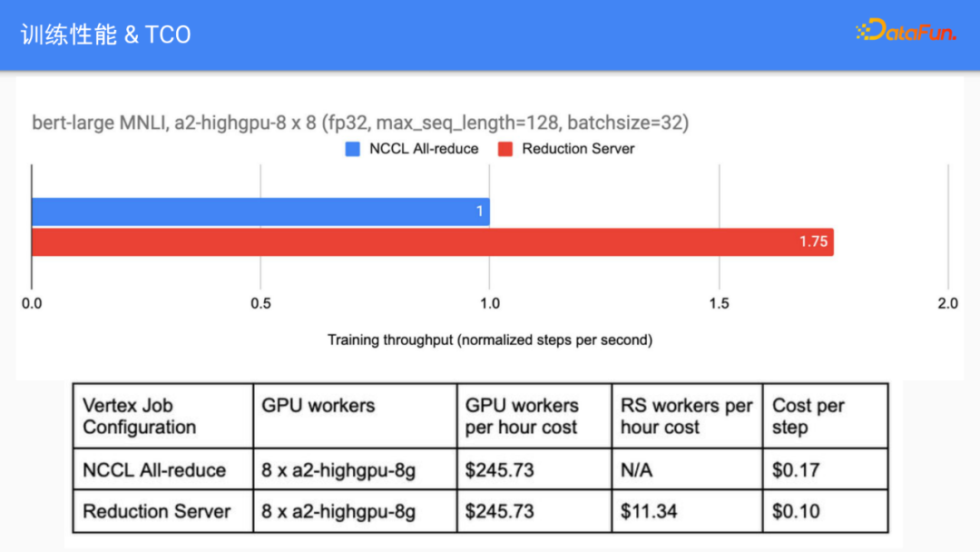 在end to end的测试里面,相对于传统的ring all-reduce, reduction server可以把训练速度提升75%左右。除了纯粹性能方面的优化,下面这个表的例子里面我们可以看到,因为相当于说我们的速度变快了,我们花费的时间也少,所以就是说它实际上总成本也能降低。即使考虑了额外的CPU节点的开销在内,用户仍然可以大幅降低训练的TCO。