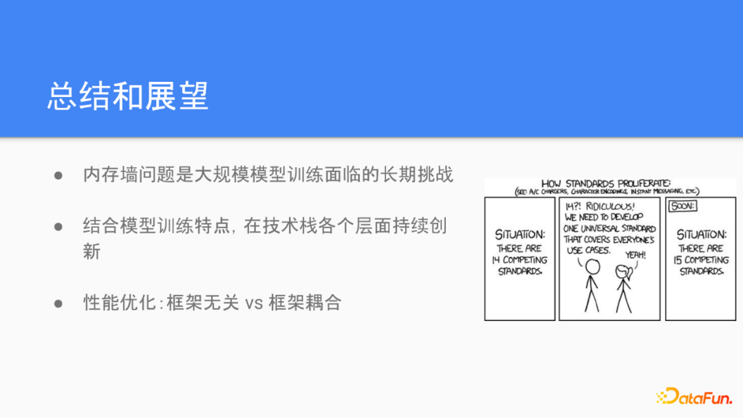 总结一下今天分享的内容,内存墙问题是目前大规模模型训练很难避开的一个问题,并且很有可能是一个长期的问题,只靠硬件的自然演进应该是不够的,所以这也是我们在框架的基础上,技术栈的各个层面做性能工作的一个大背景。未来随着业务模型的变化,我们也看到将会围绕着更多其他并情化策略的优化工作。今天我主要是从云平台的角度看,我们需要怎么样的性能优化工作,侧重分享的是跟框框架无关的底层的一些优化。但是我们也可以看到很多跟框架或者甚至模型强强耦合的一些性能工作,比如说Deep Speed或者Horovod。这实际上代表的是两种范式,也可以引出很多讨论,比如说我们在做一些上性能方面的设计的时候,是应该尽量做到平台无关,还是对于某个优化应该推出一个新的框架,或者更进一步,更好的性能是不是一个AI框架的核心竞争力,我想这些都是一些非常有意思的问题。今天我的分享就到这里,如果有问题的话也欢迎提出,谢谢大家。